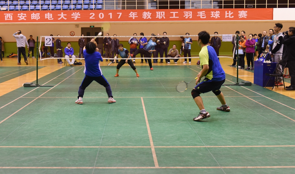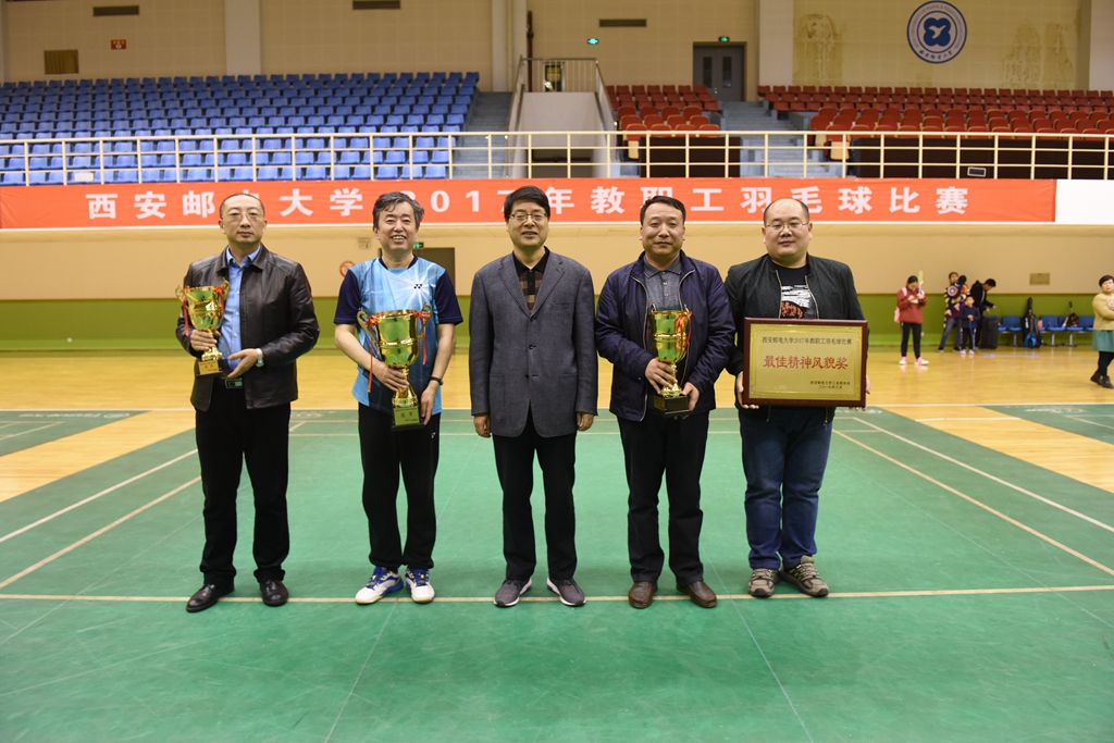 本网讯 10月24日晚,长安校区体育馆喝彩阵阵,37000v威尼斯2017年教职工羽毛球比赛决赛在此进行。经过激烈角逐,图书信息分工会获得冠军,计算机学院分工会、现代邮政学院、继职学院分工会联队分获亚军、季军,经济与管理学院分工会获得最佳精神风貌奖。学校党委副书记张新柱观看比赛并为获奖分工会颁奖。