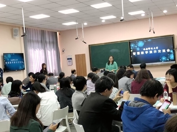 本网讯 (通讯员 赵锐)4月17日下午,教务处在长安校区西区基础教学楼组织召开智慧教学课堂演示交流会。2017年和2018年校级重点课程建设负责人、相关学院教学负责人及教师代表共60余人参加会议。教务处副处长王曙燕主持会议。