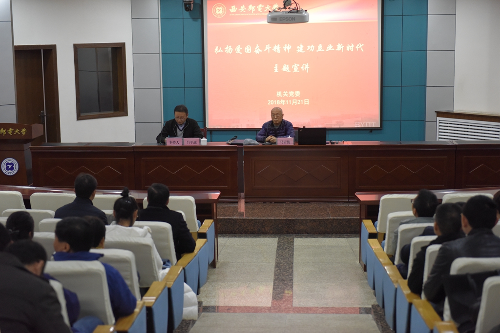 本网讯 11月21日下午,机关党委在长安校区办公楼附一楼报告厅举办“弘扬爱国奋斗精神,建功立业新时代”主题宣讲活动。学校“弘扬爱国奋斗精神、建功立业新时代”示范宣讲团实践组成员、原西安邮电学院党委副书记、副院长马青俊,示范宣讲团理论组成员、马克思主义学院副院长袁文伟应邀作主题宣讲。主题宣讲由机关党委书记兼党委组织部副部长吕军战主持,机关干部和离退休服务处在职干部参加主题宣讲。