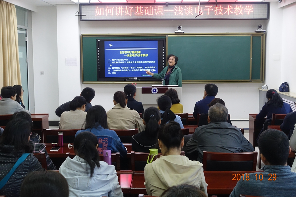 报告会上,华成英教授总结了40余年从事电子技术基础教学的经验与体会,从如何研究教学方法入手,重点对布鲁纳发现法在电子技术基础课程教学中的应用作了深入讲解,并以丰富实例,对教师如何在教学过程中引导学生发现问题、学会思考,以达到培养学生科学思维方式的教学目的做了示范。勤勤恳恳的准备,精神饱满的状态,简洁美观的PPT,富有魅力的语言……每一个细节都体现着名师风采。