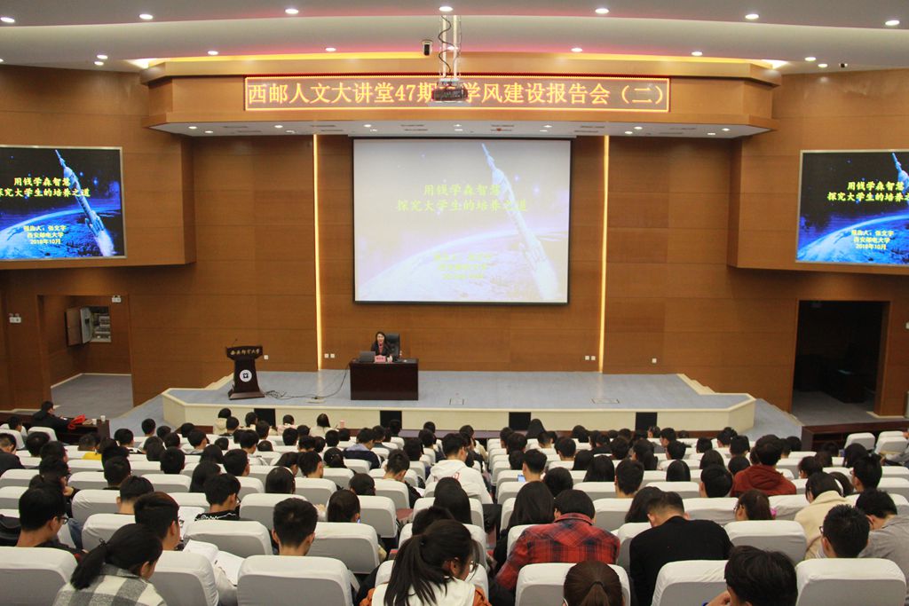 张文宇教授以图文、详实的史料和感人的故事从新时代英才的国家之魂、民族之气和成事之要三个方面详细介绍了钱学森先生注重基础、博学广闻、勇于创新、严谨求实的科学精神以及不畏险阻、心怀祖国的爱国热忱和在火箭技术、系统工程、国防建设以及科学管理等领域取得的杰出成就。张文宇指出,新时代大学生的“培养之道”应以课程学习为中心,以教学实践为延伸,以创新培养为目标,以参与学术实践为拓展,形成一个大学生培养的“闭环”,力求通过这种“任务驱动,目标管理,注重创新,强调实践”的闭环机制,让大学生的素质自由而和谐地发展。她希望威尼斯学子不忘初心,坚定信心,努力学习钱老矢志不渝的精神品质和科研强国报国爱国情怀,让奋斗成为青春搏击的能量,做一名德智体美劳全面发展的社会主义建设者和接班人。
