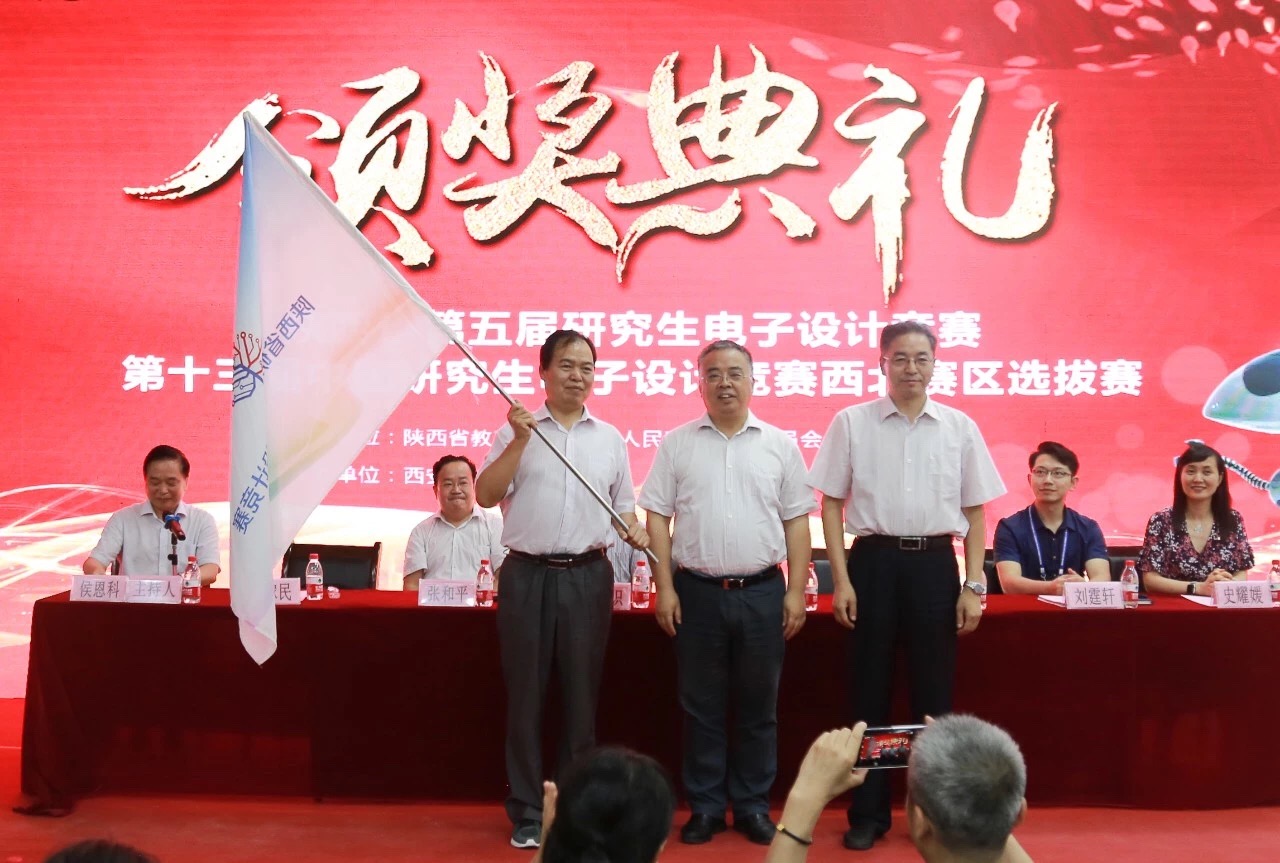 7月7日,在颁奖典礼暨闭幕式上,威尼斯副校长巩稼民接过了大赛会旗,陕西省第六届研究生电子设计竞赛暨第十四届中国研究生电子设计竞赛西北赛区选拔赛将在威尼斯举行。