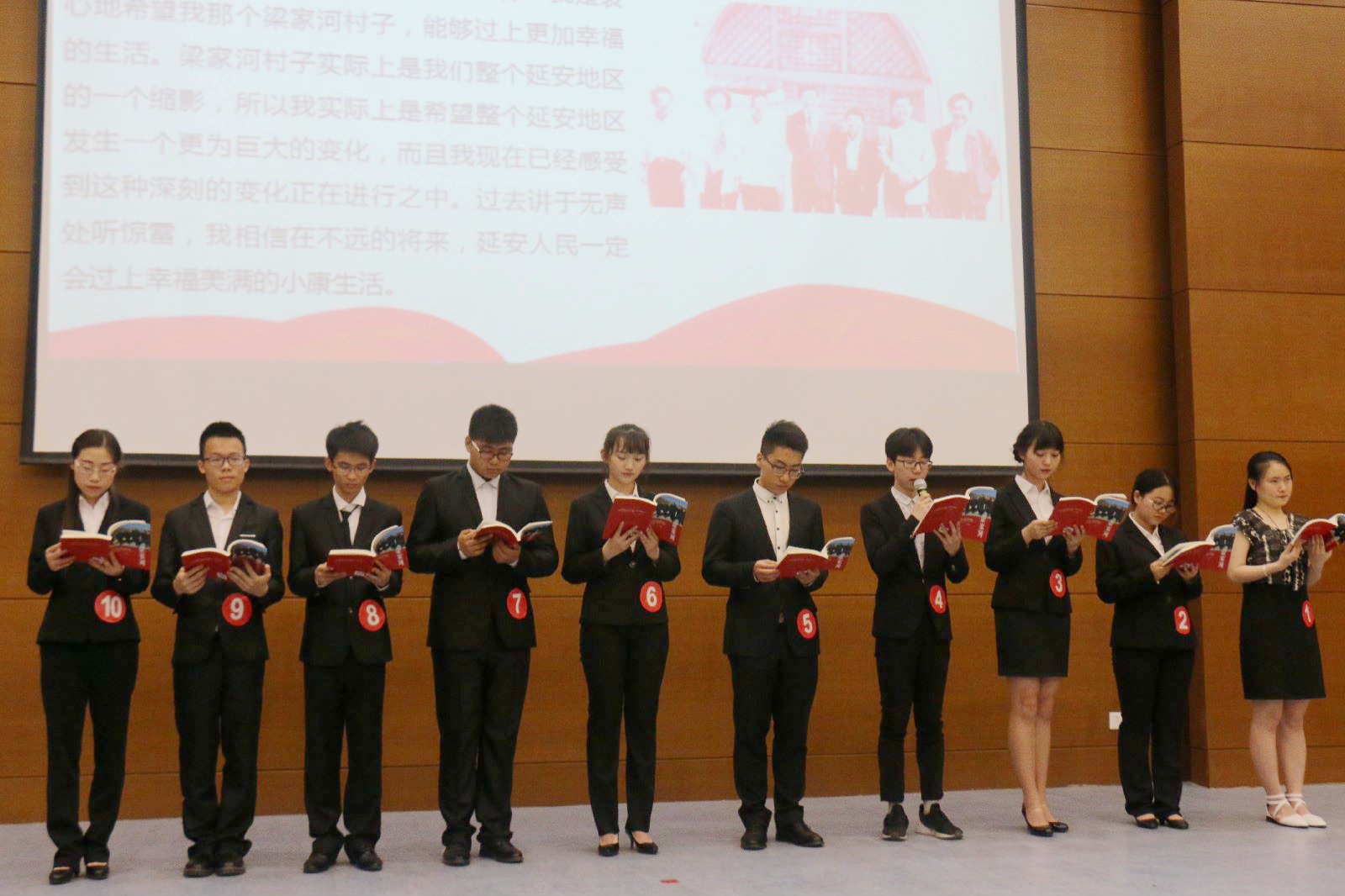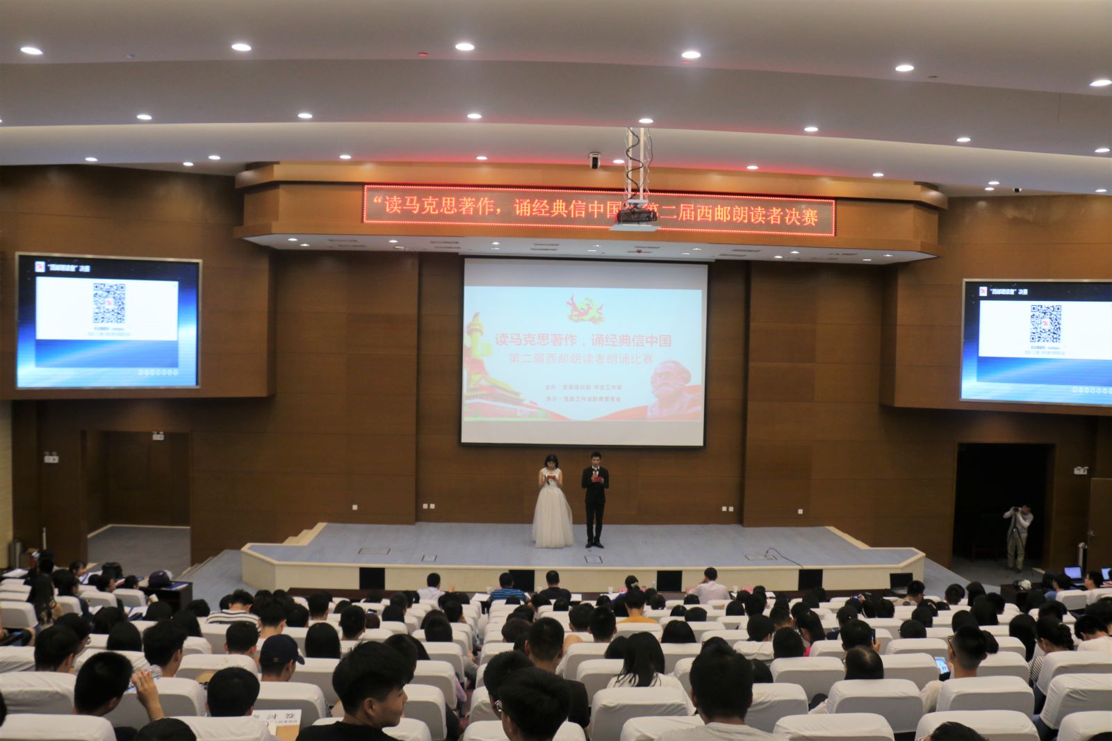 比赛正式开始前,由初赛晋升的10位优秀选手集体朗诵了《难忘梁家河》,将观众与习总书记在梁家河的知青岁月联系在一起。在随后的赛场上,选手们或慷慨激昂、或深情低沉,用自己声情并茂的朗诵,向同学们分享了《你从梁家河走来》、《青年在选择职业时的考虑》、《我的祖国》等优秀作品。互动环节,同学们积极参与,畅谈感想,一度将气氛引向高潮。比赛在集体朗诵《共产党宣言》节选的铿锵之声中结束,评委库瑞和袁文伟对选手们的精彩表现进行了点评。经过激烈的角逐,经济与管理学院林子然和外国语学院李奕获得一等奖;研究生学院王天赐、电子信息工程学院马智远、经济与管理学院付苗获得二等奖;通信与信息工程学院修海燕、马睿,电子信息工程学院王境、任武斌,自动化学院时文婷获得三等奖;“最佳人气奖”由电子信息工程学院的马智远夺得。