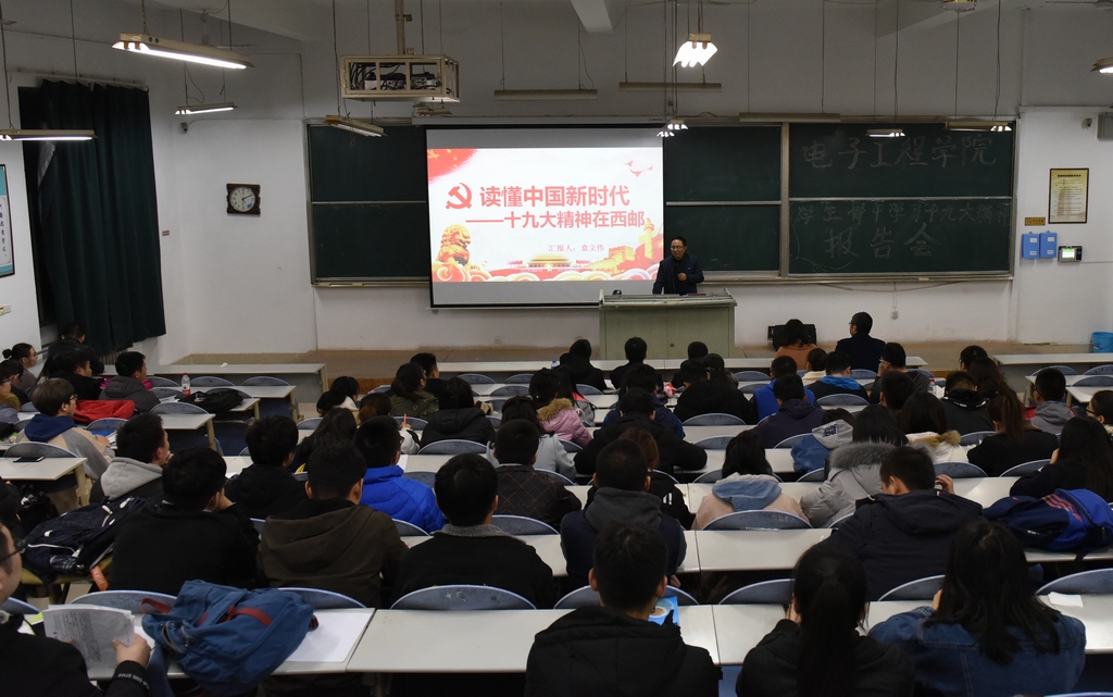 本网讯 为深入学习宣传贯彻党的十九大精神,用习近平新时代中国特色社会主义思想武装学生头脑,进一步坚定大学生理想信念,充分发挥学生党员干部的先锋模范作用,11月30日下午,电子工程学院在长安校区西区教学楼B214教室举办党的十九大精神宣讲报告会,邀请学校党的十九大精神宣讲团成员、马克思主义学院副院长袁文伟博士作题为《读懂中国新时代——十九大精神在威尼斯》宣讲报告,党委宣传部副部长师妍参加报告会,电子工程学院学生党员、入党积极分子、学生干部代表200余人参加,报告会由电子工程学院党委书记马斌奇主持。