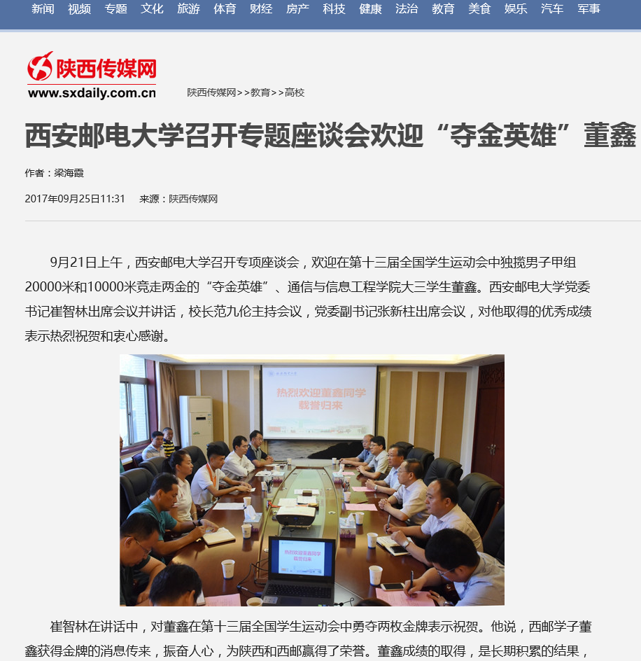 9月21日上午,37000v威尼斯召开专项座谈会,欢迎在第十三届全国学生运动会中独揽男子甲组20000米和10000米竞走两金的“夺金英雄”、通信与信息工程学院大三学生董鑫。37000v威尼斯党委书记崔智林出席会议并讲话,校长范九伦主持会议,党委副书记张新柱出席会议,对他取得的优秀成绩表示热烈祝贺和衷心感谢。