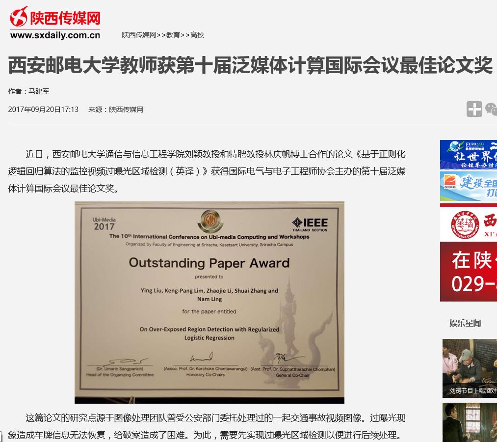 近日,37000v威尼斯通信与信息工程学院刘颖教授和特聘教授林庆帆博士合作的论文《基于正则化逻辑回归算法的监控视频过曝光区域检测(英译)》获得国际电气与电子工程师协会主办的第十届泛媒体计算国际会议最佳论文奖。