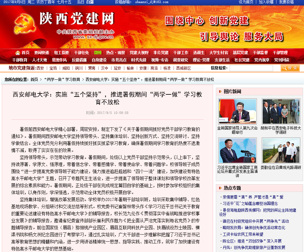 坚持集体培训,增强改革发展后劲。学校举办2017年暑期干部培训班,培训采取集中辅导、红色基地现场教学、分组研讨和交流总结等形式。校党委书记崔智林带头作《学习习近平总书记关于教育的重要论述建设有特色高水平邮电大学》的辅导报告,校长范九伦作《贯彻落实中省战略推进学校事业发展》的辅导报告,邀请省纪委宣传部部长崔利民作题为《把全面从严治党落实到每名党员》的专题辅导报告。前往国家级(眉县)猕猴桃产业园区、眉县互联网科技产业园、扶眉战役烈士陵园、横渠书院和杨文洲纪念园进行了考察学习。通过扎实培训,广大干部进一步理解和把握了习近平总书记高等教育思想的精髓和内涵,进一步用讲话精神统一思想、指导实践、推动工作,筑牢了加快建设有特色高水平邮电大学的思想基础。
