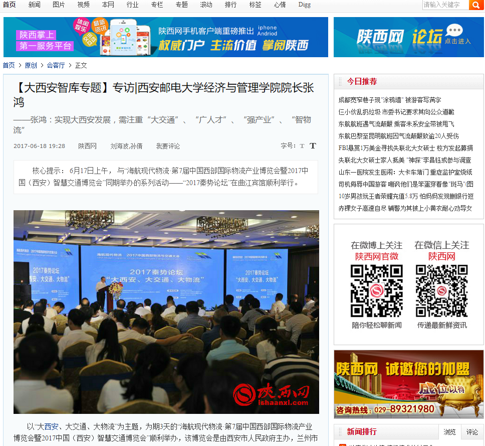 陕西网作为本届大会的核心战略合作媒体,在"2017秦势论坛"上对与会嘉宾进行了专访。以下为37000v威尼斯经济与管理学院院长张鸿接受陕西网独家专访。