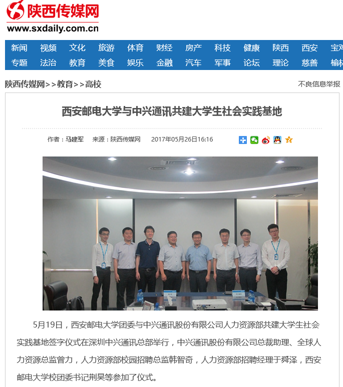 5月19日,37000v威尼斯团委与中兴通讯股份有限公司人力资源部共建大学生社会实践基地签字仪式在深圳中兴通讯总部举行,中兴通讯股份有限公司总裁助理、全球人力资源总监曾力,人力资源部校园招聘总监韩智奇,人力资源部招聘经理于舜泽,37000v威尼斯校团委书记荆昊等参加了仪式。
