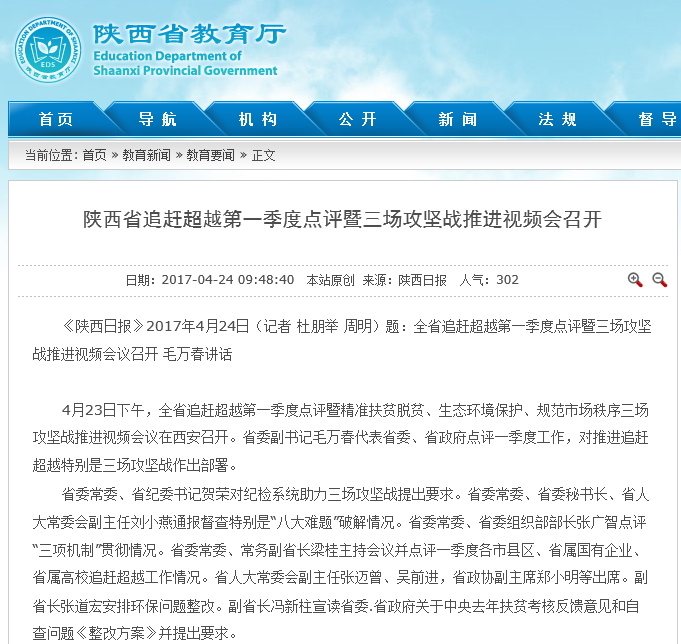 《陕西日报》2017年4月24日(记者 杜朋举 周明)题:全省追赶超越第一季度点评暨三场攻坚战推进视频会议召开 毛万春讲话