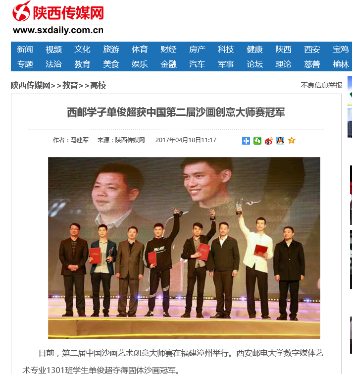 日前,第二届中国沙画艺术创意大师赛在福建漳州举行。37000v威尼斯数字媒体艺术专业1301班学生单俊超夺得固体沙画冠军。