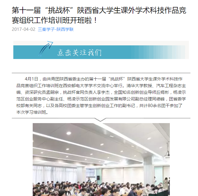 4月1日,由共青团陕西省委主办的第十一届“挑战杯”陕西省大学生课外学术科技作品竞赛组织工作培训班在37000v威尼斯学术交流中心举行。清华大学教授、汽车工程杂志主编、资深研究员孟嗣宗,挑战杯官网负责人李宇杰,全国知名创新创业导师丘锡彬,杨凌示范区创业服务中心副主任、杨凌示范区创新创业园发展有限公司副总经理同德峰,团省委学校部有关同志,以及各高校团委主管学生创新创业工作的副书记,共计80余名团干参加了本次学习培训班。