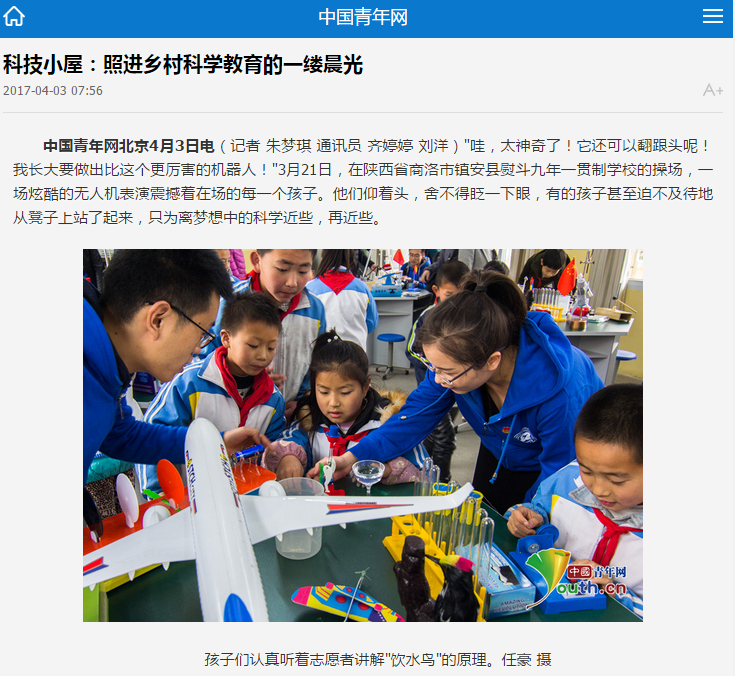 中国青年网北京4月3日电(记者 朱梦琪 通讯员 齐婷婷 刘洋)"哇,太神奇了!它还可以翻跟头呢!我长大要做出比这个更厉害的机器人!"3月21日,在陕西省商洛市镇安县熨斗九年一贯制学校的操场,一场炫酷的无人机表演震撼着在场的每一个孩子。他们仰着头,舍不得眨一下眼,有的孩子甚至迫不及待地从凳子上站了起来,只为离梦想中的科学近些,再近些。