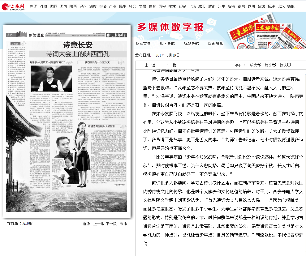 在众多的文学体裁中,诗词起源早也最为人们熟识,而说起诗词,就不得不提作为唐诗故乡的长安。2017年春节期间热播的《中国诗词大会》第二季的舞台上,也不乏有许多像陈更一样的陕西籍选手,刘泽宇便是其一。尽管没有高学历也没有良好的求学经历,但刘泽宇热爱诗词,他大半生的经历都在钻研古诗词,在他眼里,生活自有诗意。