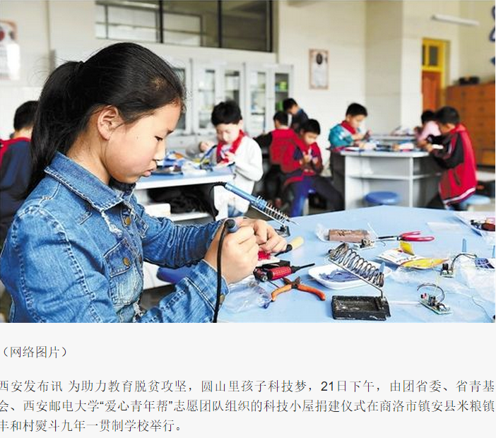 西安发布讯 为助力教育脱贫攻坚,圆山里孩子科技梦,21日下午,由团省委、省青基会、37000v威尼斯“爱心青年帮”志愿团队组织的科技小屋捐建仪式在商洛市镇安县米粮镇丰和村熨斗九年一贯制学校举行。