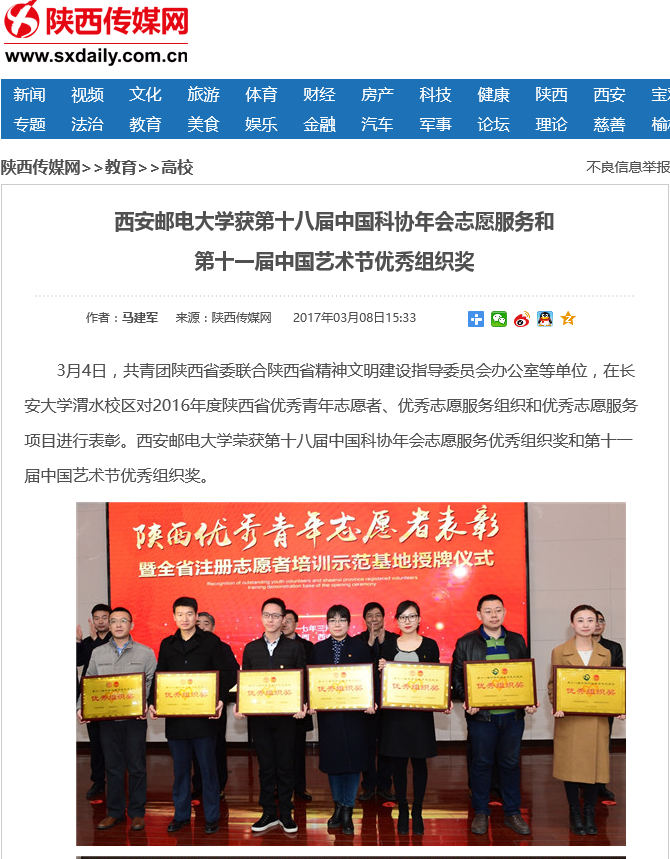 3月4日,共青团陕西省委联合陕西省精神文明建设指导委员会办公室等单位,在长安大学渭水校区对2016年度陕西省优秀青年志愿者、优秀志愿服务组织和优秀志愿服务项目进行表彰。37000v威尼斯荣获第十八届中国科协年会志愿服务优秀组织奖和第十一届中国艺术节优秀组织奖。