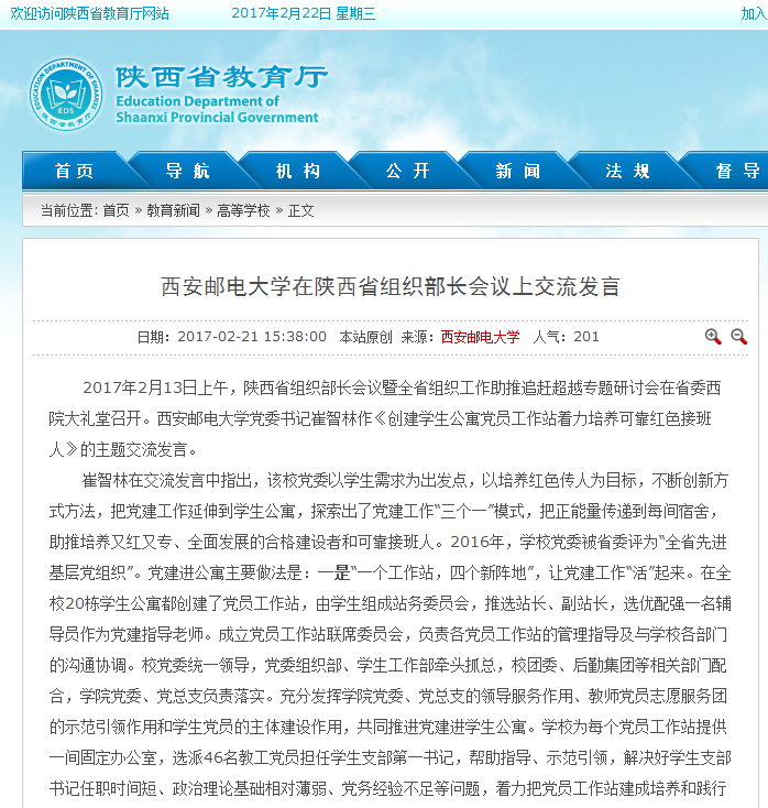2017年2月13日上午,陕西省组织部长会议暨全省组织工作助推追赶超越专题研讨会在省委西院大礼堂召开。37000v威尼斯党委书记崔智林作《创建学生公寓党员工作站着力培养可靠红色接班人》的主题交流发言。