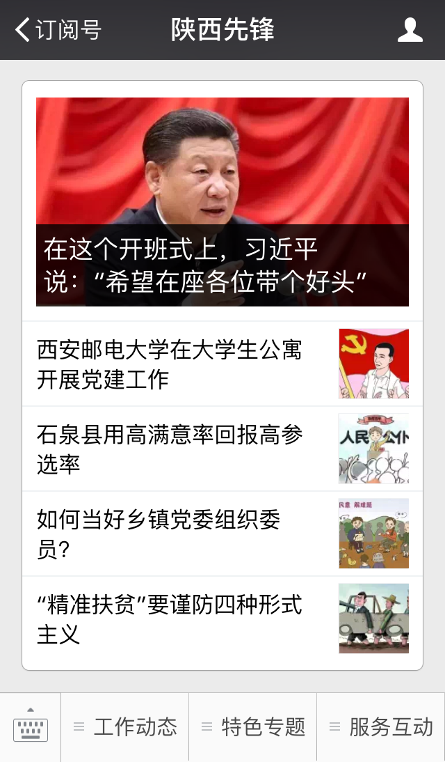 “陕西先锋”微信号:SXXWZZBWX,帐号主体为中共陕西省委组织部,主要功能为传播党建理论、反映工作动态、展示组工成果、教育党员干部、服务基层群众。