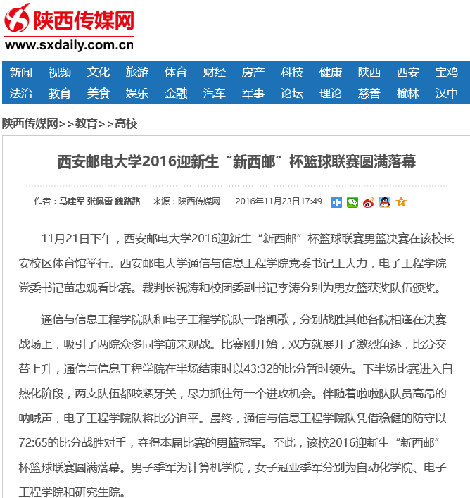 通信与信息工程学院队和电子工程学院队一路凯歌,分别战胜其他各院相逢在决赛战场上,吸引了两院众多同学前来观战。比赛刚开始,双方就展开了激烈角逐,比分交替上升,通信与信息工程学院在半场结束时以43:32的比分暂时领先。下半场比赛进入白热化阶段,两支队伍都咬紧牙关,尽力抓住每一个进攻机会。伴随着啦啦队队员高昂的呐喊声,电子工程学院队将比分追平。最终,通信与信息工程学院队凭借稳健的防守以72:65的比分战胜对手,夺得本届比赛的男篮冠军。至此,该校2016迎新生“新威尼斯”杯篮球联赛圆满落幕。男子季军为计算机学院,女子冠亚季军分别为自动化学院、电子工程学院和研究生院。