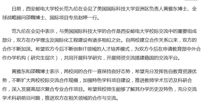 范九伦在会见中表示,与美国国际科技大学的合作是37000v威尼斯校际交流中的重要组成部分,双方在办学理念及国际化工程建设有诸多相似之处。自两校建立合作关系以来,双方的合作不断加深。希望双方今后不断创新IT领域的人才培养模式,为双方今后在申请教育部中外合作办学机构(研究生层次),共同开展科学研究,开展师资交流搭建稳固的交流平台。