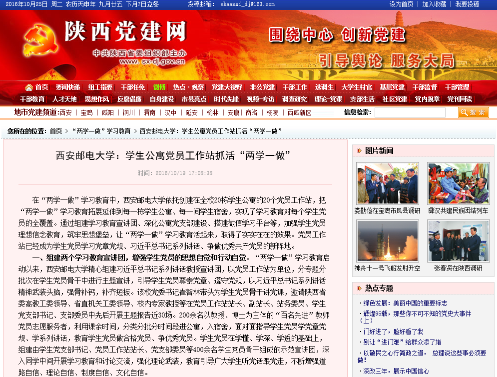 二、深化学生公寓党支部建设,实现学习教育对学生党员的全覆盖。37000v威尼斯把学生党支部建在公寓,在学生党员人数较多、条件成熟的公寓探索建立学生党总支。在“两学一做”学习教育中,该校不断深化学生公寓党支部、党总支建设,从在党员工作站表现突出的党员骨干中选优配强党支部书记,从优秀的教工党员中为学生党支部选派“第一书记”,强化组织功能,健全体制机制,实现党员工作站与公寓党支部、党总支的有效对接,逐步完善公寓组织网络体系化建设。公寓党支部与党员工作站在学习教育中相互配合、相互促进,学生入党和预备党员转正,增加征求党员工作站意见,确保党员发展质量。公寓立体交叉式的组织网络体系,加强了学生党支部之间、学生党员与普通同学之间、党员工作站之间的学习、交流和研讨,充分发挥了学生党员的先锋模范作用和示范带头作用,实现了学生的自我管理、自我服务、自我教育,达到学习教育对学生党员的全覆盖,促进了“两学一做”学习教育的常态化、制度化、系统化。