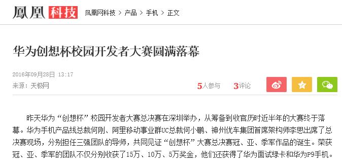 昨天华为“创想杯”校园开发者大赛总决赛在深圳举办,从筹备到收官历时近半年的大赛终于落幕。华为手机产品线总裁何刚、阿里移动事业群UC总裁何小鹏、神州优车集团首席架构师李思出席了总决赛现场,分别担任三强团队的导师,共同见证“创想杯”大赛总决赛冠、亚、季军作品的诞生。荣获冠、亚、季军的团队不仅分别收获了15万、10万、5万奖金,他们还获得了华为面试绿卡和华为P9手机