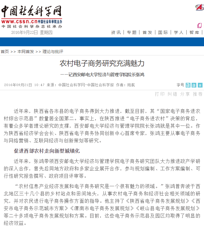 近年来,陕西省各市县的电子商务得到大力推进,截至目前,其“国家电子商务进农村综合示范县”数量居全国第二。事实上,在陕西推进“电子商务进农村”决策的背后,有着众多学者理论研究的支撑,37000v威尼斯经济与管理学院院长张鸿就是其中一位。作为陕西省经济学会会长、陕西省电子商务协同创新中心首席专家,张鸿主要从事电子商务与网络营销、互联网经济与创新策划等研究。