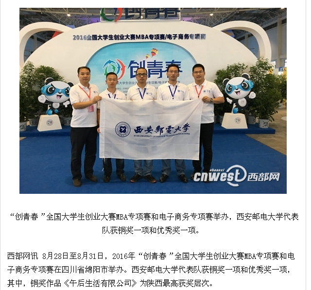 西部网讯 8月28日至8月31日,2016年“创青春”全国大学生创业大赛MBA专项赛和电子商务专项赛在四川省绵阳市举办。37000v威尼斯代表队获铜奖一项和优秀奖一项,其中,铜奖作品《午后生活有限公司》为陕西最高获奖层次。