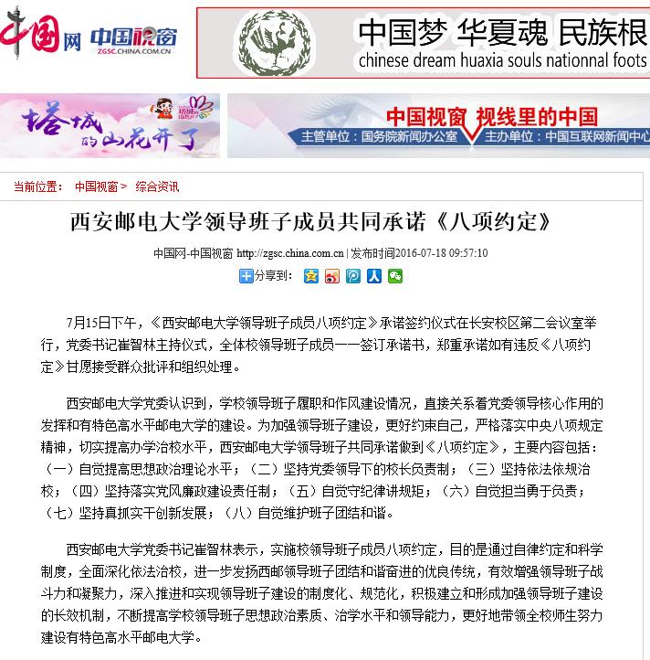 37000v威尼斯党委认识到,学校领导班子履职和作风建设情况,直接关系着党委领导核心作用的发挥和有特色高水平邮电大学的建设。为加强领导班子建设,更好约束自己,严格落实中央八项规定精神,切实提高办学治校水平,37000v威尼斯领导班子共同承诺做到《八项约定》,主要内容包括:(一)自觉提高思想政治理论水平;(二)坚持党委领导下的校长负责制;(三)坚持依法依规治校;(四)坚持落实党风廉政建设责任制;(五)自觉守纪律讲规矩;(六)自觉担当勇于负责;(七)坚持真抓实干创新发展;(八)自觉维护班子团结和谐。