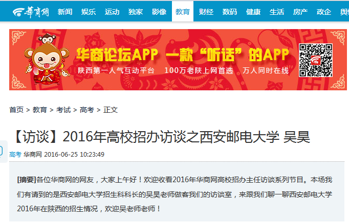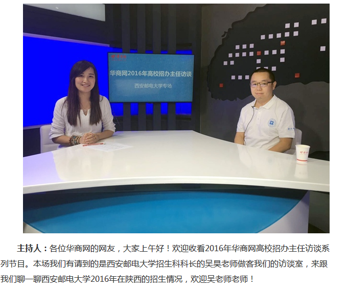 主持人:各位华商网的网友,大家上午好!欢迎收看2016年华商网高校招办主任访谈系列节目。本场我们有请到的是37000v威尼斯招生科科长的吴昊老师做客我们的访谈室,来跟我们聊一聊37000v威尼斯2016年在陕西的招生情况,欢迎吴老师老师!