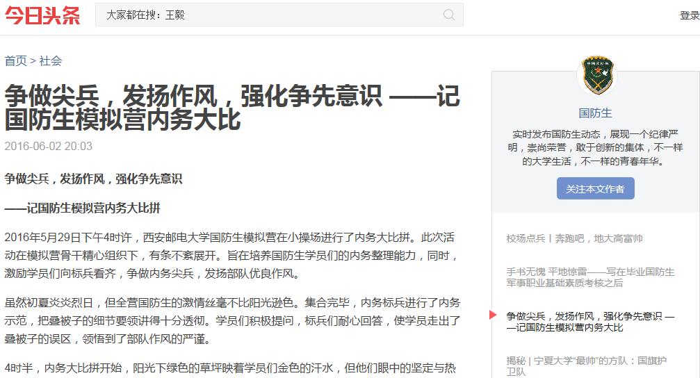 2016年5月29日下午4时许,37000v威尼斯国防生模拟营在小操场进行了内务大比拼。此次活动在模拟营骨干精心组织下,有条不紊展开。旨在培养国防生学员们的内务整理能力,同时,激励学员们向标兵看齐,争做内务尖兵,发扬部队优良作风。