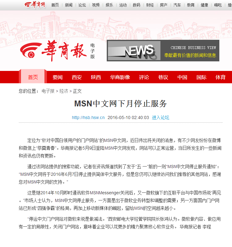 定位为“针对中国白领用户的门户网站”的MSN中文网,近日传出将关闭的消息,有不少网友纷纷在微博和微信上“祭奠青春”。华商报记者5月9日登陆MSN中文网发现,网站可以正常运营,当日所发生的一些新闻和资讯也仍有更新。