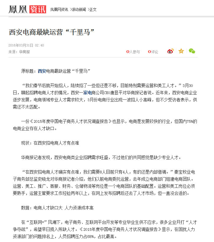 “在西安招电商人才确实有点难,我们需要8人目前只有4人,有的还是内部借调。”秦宝牧业电子商务部总监史晓龙对华商报记者介绍,他们以前电商委托运营,去年成立电商部门组建电商团队。运营、美工、推广、客服、财务、仓储物流等岗位是一个电商团队的基础配置。运营和美工岗位必须要熟手,运营主管要求工作经验两年以上,在网上发布招聘后还去了人才市场,但一直没合适的。