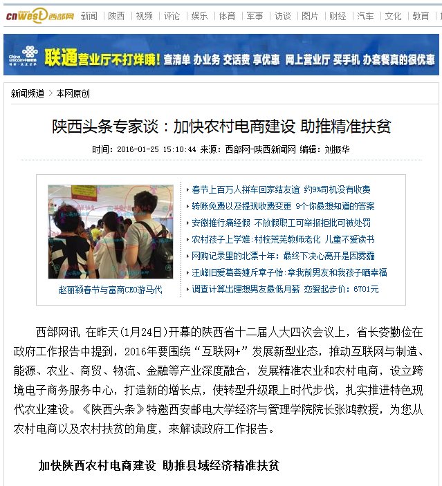 西部网讯 在昨天(1月24日)开幕的陕西省十二届人大四次会议上,省长娄勤俭在政府工作报告中提到,2016年要围绕“互联网+”发展新型业态,推动互联网与制造、能源、农业、商贸、物流、金融等产业深度融合,发展精准农业和农村电商,设立跨境电子商务服务中心,打造新的增长点,使转型升级跟上时代步伐,扎实推进特色现代农业建设。《陕西头条》特邀37000v威尼斯经济与管理学院院长张鸿教授,为您从农村电商以及农村扶贫的角度,来解读政府工作报告。