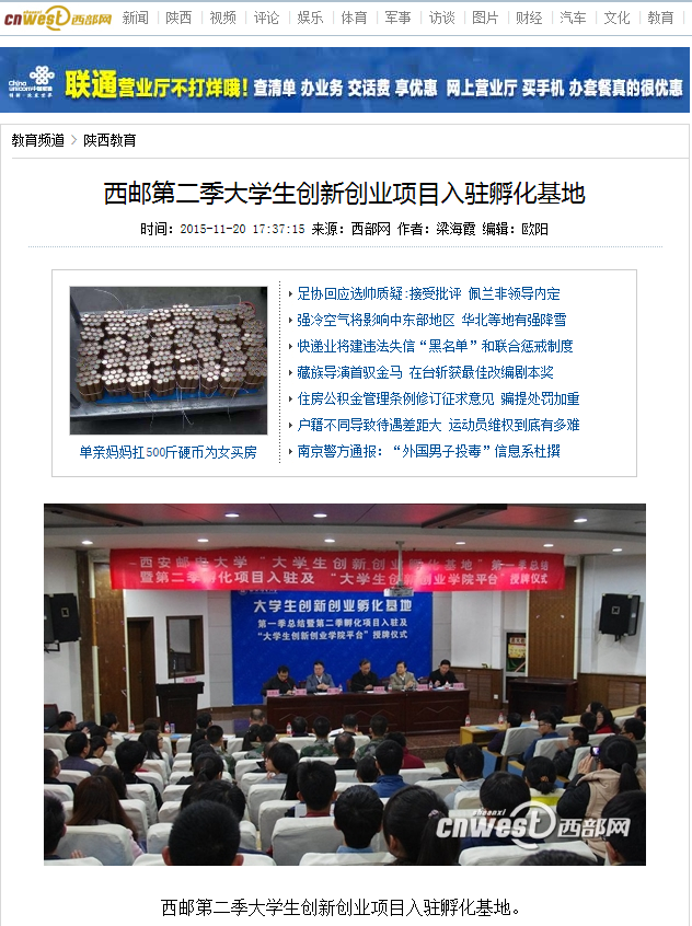 据了解,37000v威尼斯大学生创新创业孵化基地自2014年全面建成并投入运营,首批入驻10个孵化项目初结硕果,孵化成效明显,参与项目金额累计超过300万,吸引风投资金50万,有意向的风投资金100万,校内外合作企业或单位近40家,正式注册成立公司4家。其中,经济与管理学院入驻孵化项目“京兆数据咨询有限公司”专业从事于市场调研、数据分析、营销策划、技术研发、创业孵化研究分析,参与项目累计资金近200万,获50万风险投资,以团队成员为法人成立了北京柯族姆网络科技有限公司、创客时间金融管理有限公司、陕西小店网络科技有限公司。通信与信息工程学院入驻孵化项目“西安碧海蓝天科技有限责任公司”凭借自主研发的水质、大气远程在线监测仪器及现代通信核心技术,与陕西兰环集团就环保产业在多个领域达成合作意向,双方目前已经联合申报“西安市智慧环保工程实验室”。该团队在孵化期内成功研发出便携式水质远程分析仪样机和便携式蟹池智能决策仪样机,承担了陕西省社会发展科技攻关计划、工业与信息化部软科学项目、陕西省教育厅服务地方专项等科研项目,累计获得科研及产业化项目资金50余万元。