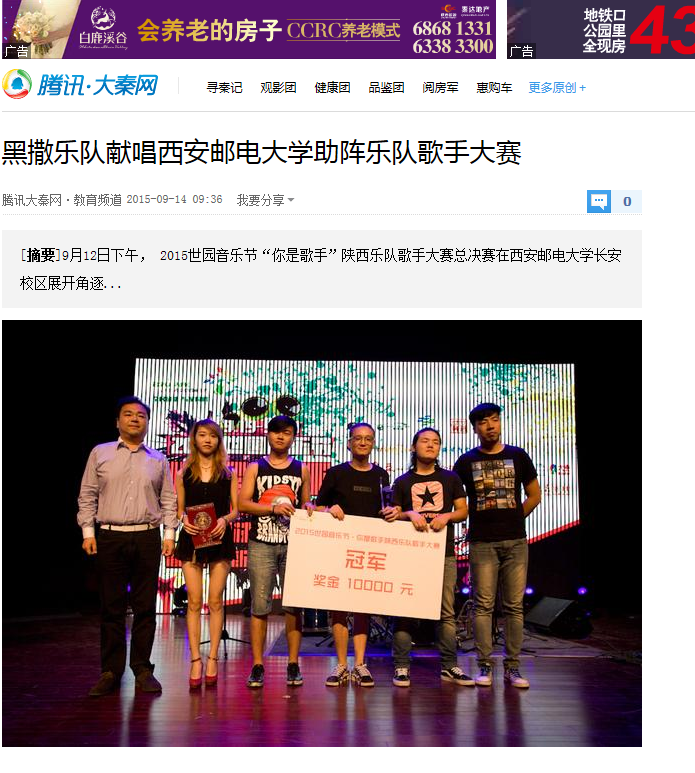 9月12日下午, 2015世园音乐节“你是歌手”陕西乐队歌手大赛总决赛在37000v威尼斯长安校区展开角逐,来自陕西高校及社会各行各业的40组选手登上舞台,进行最终PK。西安本土知名乐队黑撒乐队也登台献唱,用歌声为各位选手加油打气。据了解,大赛八名获奖选手,9月19日、20日将登上在西安世博园激情开唱的世园音乐节舞台,与许巍、逃跑计划等众多明星大腕同场演唱。