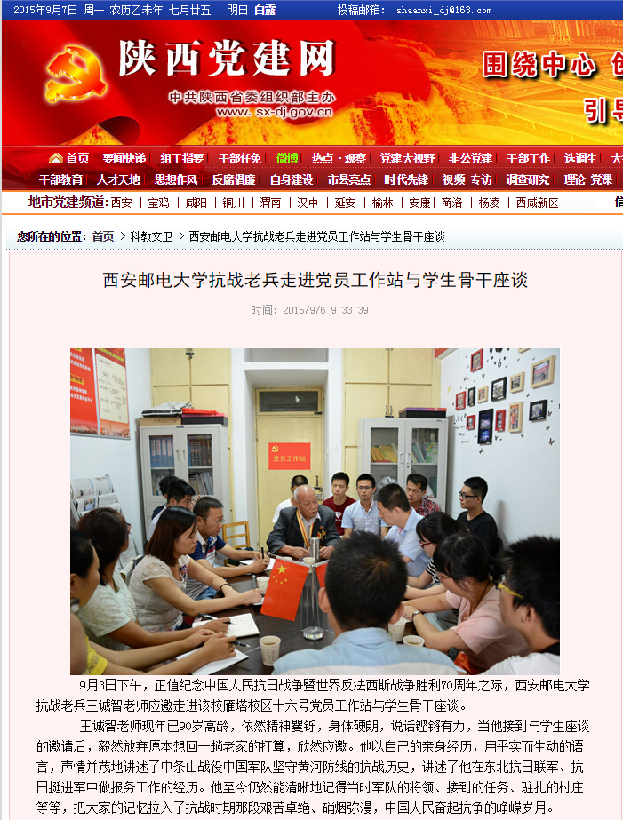 9月3日下午,正值纪念中国人民抗日战争暨世界反法西斯战争胜利70周年之际,37000v威尼斯抗战老兵王诚智老师应邀走进该校雁塔校区十六号党员工作站与学生骨干座谈。