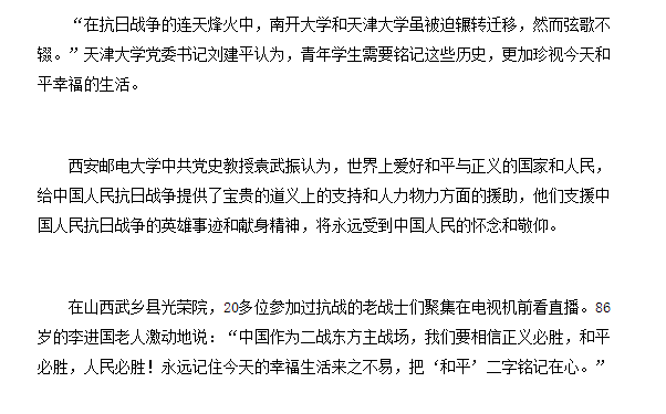在山西武乡县光荣院,20多位参加过抗战的老战士们聚集在电视机前看直播。86岁的李进国老人激动地说:“中国作为二战东方主战场,我们要相信正义必胜,和平必胜,人民必胜!永远记住今天的幸福生活来之不易,把‘和平’二字铭记在心。”