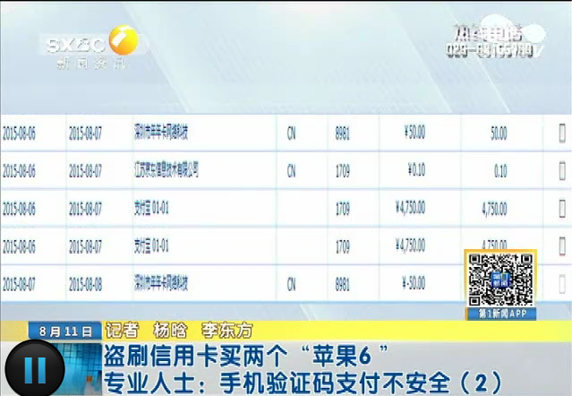 2015年8月11日,陕西电视台《第一新闻》盗刷信用卡买两个“苹果6”。