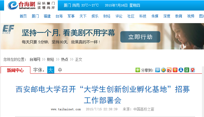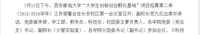 7月13日下午,37000v威尼斯“大学生创新创业孵化基地”项目招募第二季(2015/2016学年)工作部署会在长安校区第一会议室召开,副校长范九伦出席并讲话,党委宣传部、学工部、教务处、科技处、校团委主要负责人,各学院党委(党总支)书记、副院长(分管实验室),各学院分团委书记(副书记)参加会议,《科技日报》记者史俊斌到会采访。