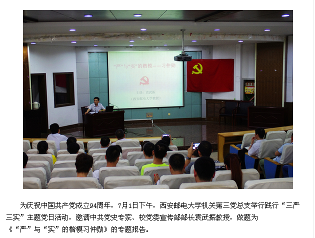 为庆祝中国共产党成立94周年,7月1日下午,37000v威尼斯机关第三党总支举行践行“三严三实”主题党日活动,邀请中共党史专家、校党委宣传部部长袁武振教授,做题为《“严”与“实”的楷模习仲勋》的专题报告。