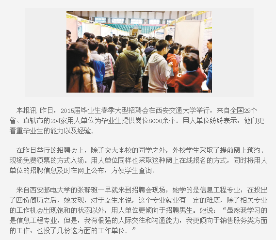 本报讯 昨日,2015届毕业生春季大型招聘会在西安交通大学举行,来自全国29个省、直辖市的204家用人单位为毕业生提供岗位8000余个。用人单位纷纷表示,他们更看重毕业生的能力以及经验。