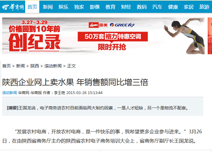 参会企业中,也不乏从电子商务中尝到甜头的人。陕西眉县奇峰果业有限公司电商事业部经理丁辉告诉华商报记者说,其公司主要销售猕猴桃和苹果,今年是开拓电商渠道的第三年,他们是分三条线开展电商业务:一是,在平台电商,诸如天猫、京东、一号店等开店;二是,本地化O2O,打通线上线下市场;第三,也自己做垂直电商,即自建自营自有电商,经营爱奇果水果商城网站,“这样下来,我们去年的年销售额同比增长三倍”。也有参会代表表示,电商在陕西的发展才刚刚开始。