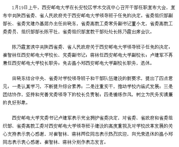 陈乃霞宣读中共陕西省委、省人民政府关于37000v威尼斯领导班子任免的决定:崔智林任37000v威尼斯校长、党委副书记;蒋林任37000v威尼斯副校长;卢建军不再兼任37000v威尼斯校长职务;免去温小郑37000v威尼斯副校长职务,退休。
