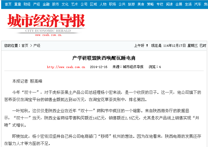 尽管今年 “双十一”虎标公司战绩彪悍,但杨小宏认为这顶多是鹤立鸡群。“这个成绩放在陕西还算不错,但和东部地区同类企业一比,简直微不足道。”