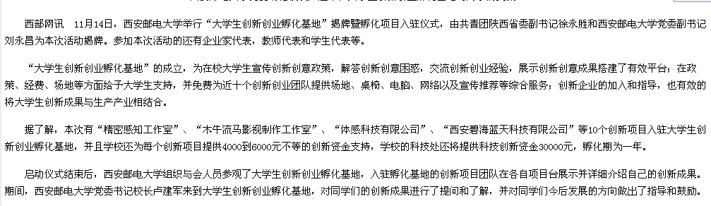 据了解,本次有“精密感知工作室”、“木牛流马影视制作工作室”、“体感科技有限公司”、“西安碧海蓝天科技有限公司”等10个创新项目入驻大学生创新创业孵化基地,并且学校还为每个创新项目提供4000到6000元不等的创新资金支持,学校的科技处还将提供科技创新资金30000元,孵化期为一年。