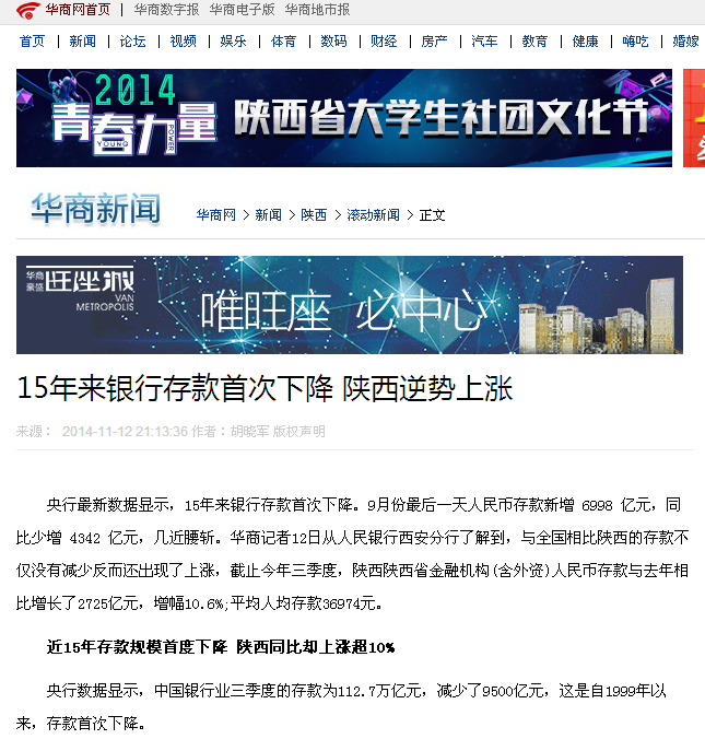 近15年存款规模首度下降 陕西同比却上涨超10%