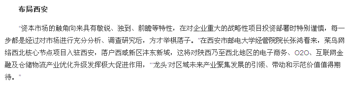“资本市场的触角向来具有敏锐、独到、前瞻等特性,在对企业重大的战略性项目投资部署时特别谨慎,每一步都是经过对市场进行充分分析、调查研究后,方才举棋落子。”在西安市邮电大学经管院院长张鸿看来,菜鸟网络西北核心节点项目入驻西安,落户西咸新区沣东新城,这将对陕西乃至西北地区的电子商务、O2O、互联网金融及仓储物流产业优化升级发挥极大促进作用,“‘龙头’对区域未来产业聚集发展的引领、带动和示范价值值得期待。”