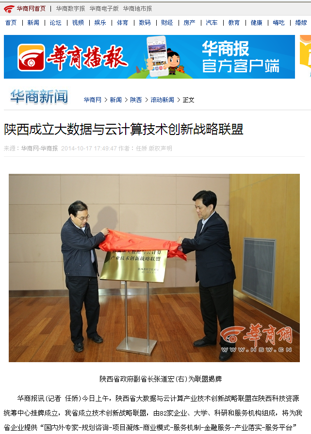 华商报讯(记者 任娇)今日上午,陕西省大数据与云计算产业技术创新战略联盟在陕西科技资源统筹中心挂牌成立,我省成立技术创新战略联盟,由82家企业、大学、科研和服务机构组成,将为我省企业提供“国内外专家-规划咨询-项目凝炼-商业模式-服务机制-金融服务-产业落实-服务平台”的金融链和服务链。