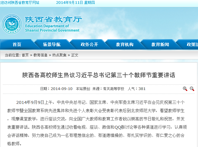 2014年9月9日上午,中共中央总书记、国家主席、中央军委主席习近平在会见庆祝第三十个教师节暨全国教育系统先进集体和先进个人表彰大会受表彰代表后到北京师范大学,看望教师学生,观摩课堂教学,进行座谈交流,向全国广大教师和教育工作者致以崇高的节日敬礼和祝贺,并发表重要讲话。陕西各高校师生通过收看电视、座谈、微信和QQ群讨论等各种渠道进行学习,认真领会讲话精神,努力使自己成为一名有理想信念的、有道德情操的、有扎实学识的、有仁爱之心的合格教师。